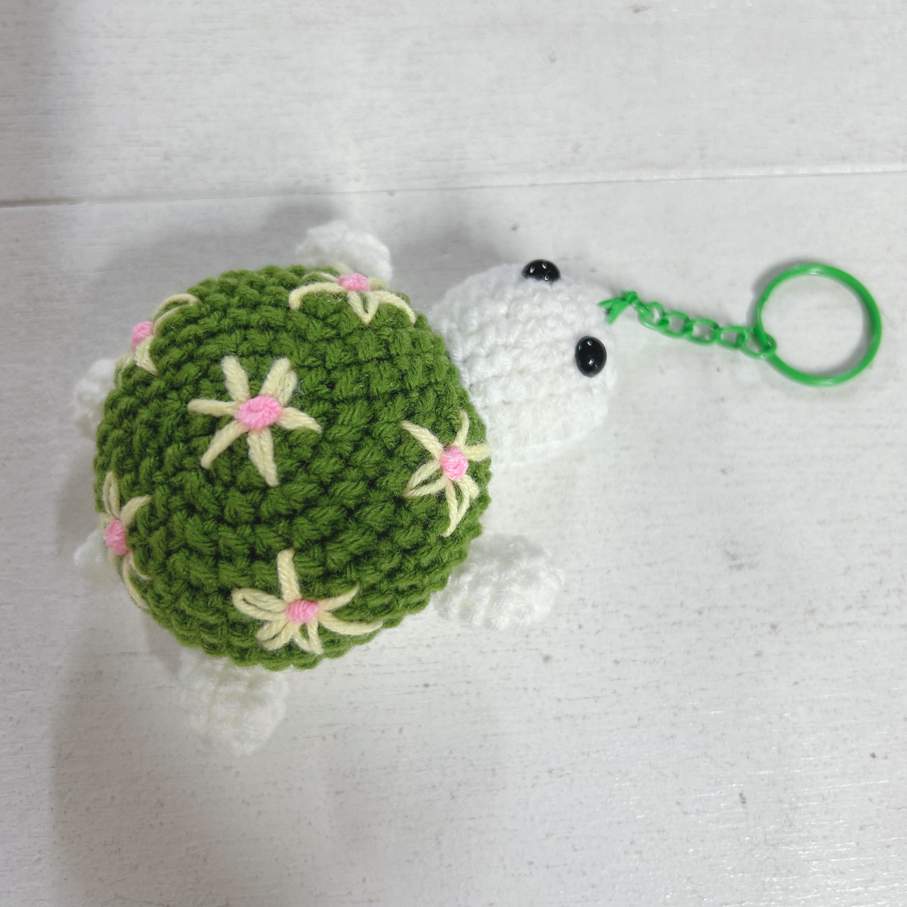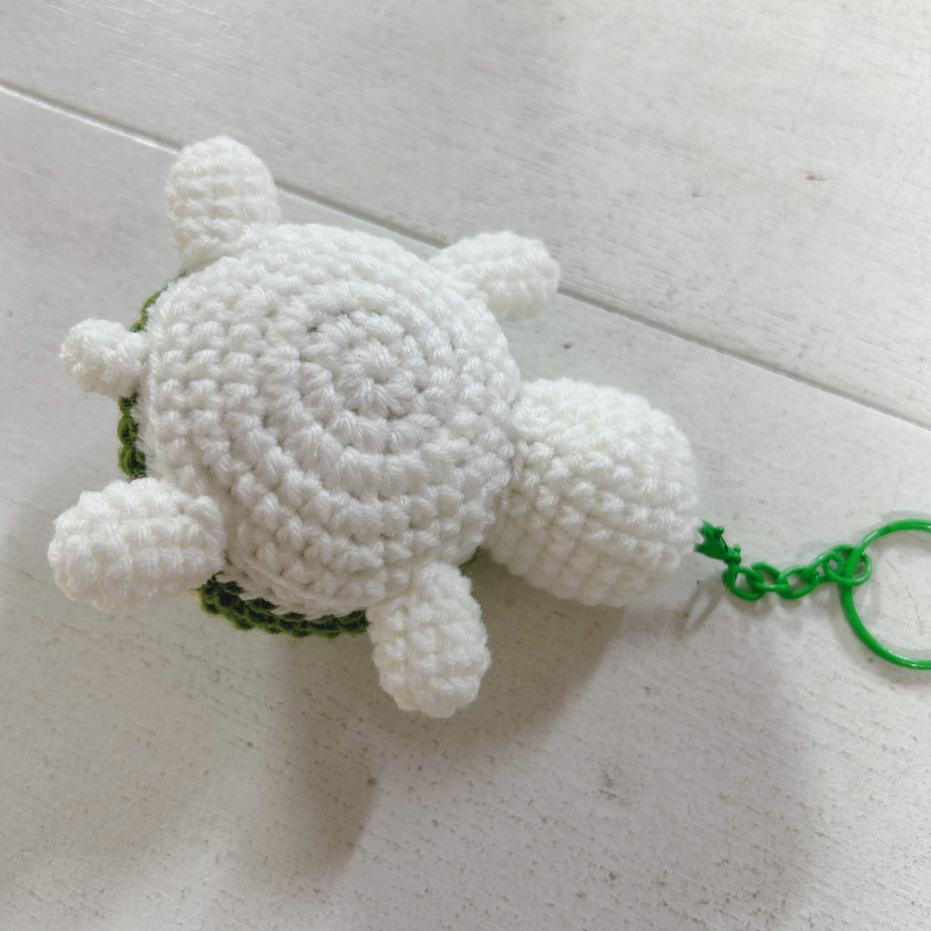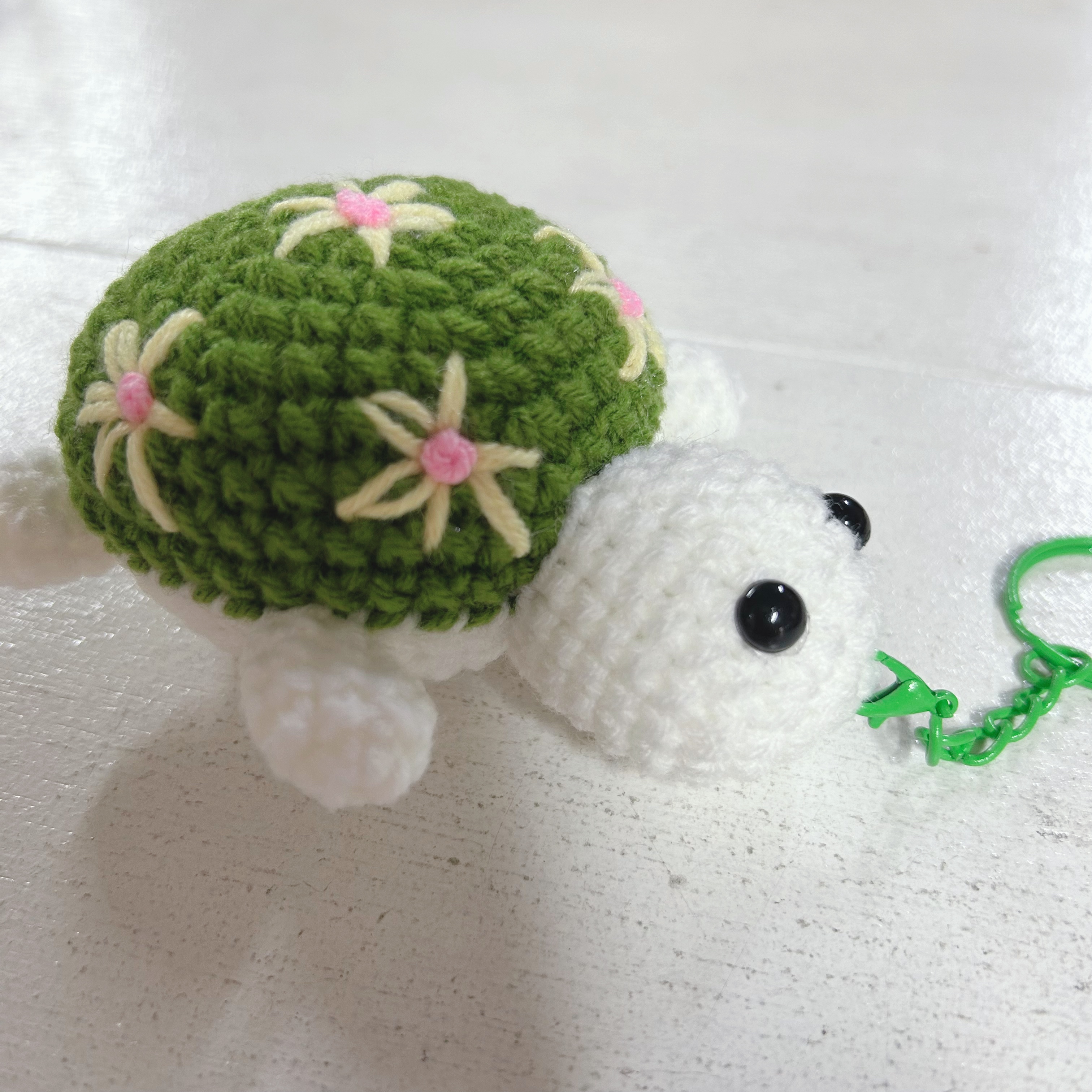 ひとつひとつ手編みした可愛いカメのキーホルダーバッグや鍵、ポーチに付けるだけで、愛らしく温かみのあるアクセントをプラスします。甲羅には可愛らしいフラワーモチーフをあしらいました。